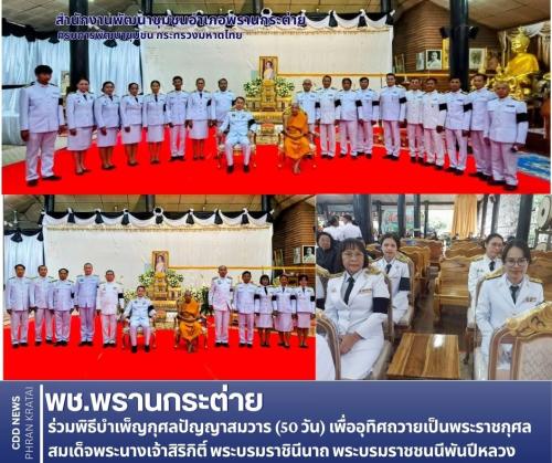 นางสาววจีพร รงค์ทอง พัฒนาการอำเภอพรานกระต่าย มอบหมายให้ นางสาวอุไรวรรณ สมิตร พร้อมด้วยเจ้าหน้าที่พัฒนาชุมชน ร่วมพิธีบำเพ็ญกุศลและแสดงความอาลัยในวาระครบ 50 วัน (ปัญญาสมวาร) เพื่ออุทิศถวายเป็นพระราชกุศล สมเด็จพระนางเจ้าสิริกิติ์พระบรมราชินีนาถ พระบรมราชชนนีพันปีหลวง โดยมี หัวส่วนราชการอำเภอ, นายกกิ่งกาชาดอำเภอ, กำนัน, ผู้ใหญ่บ้าน และประชาชนทั่วไป เข้าร่วมพิธีฯ ทั้งนี้ นายเศกสันต์ สารการ นายอำเภอพรานกระต่าย เป็นประธานในพิธีฯ