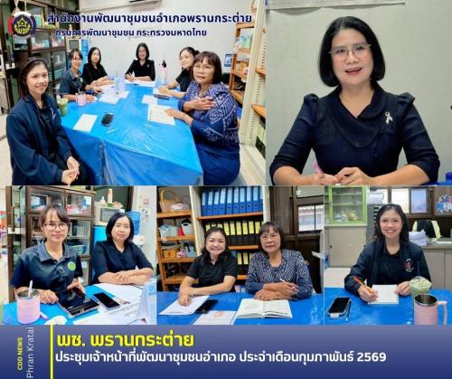 สำนักงานพัฒนาชุมชนอำเภอพรานกกระต่าย โดยนางสาววจีพร รงค์ทอง พัฒนาการอำเภอพรานกระต่าย พร้อมด้วยเจ้าหน้าที่พัฒนาชุมชนอำเภอ ร่วมประชุมเจ้าหน้าที่พัฒนาชุมชนอำเภอ ประจำเดือนกุมภาพันธ์ 2569 เพื่อติดตามผลการดำเนินงานตามแผนการดำเนินงานและแผนการใช้จ่ายประจำปีงบประมาณ พ.ศ. 2569, การติดตามการดำเนินงานตามแผนการดำเนินงานและแผนการใช้จ่ายกองทุนพัฒนาบทบาทสตรี ประจำปีงบประมาณ พ.ศ. 2569 และวางแผนการขับเคลื่อนกิจกรรมประจำเดือนกุมภาพันธ์ 2569