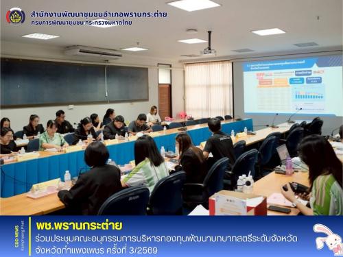 สำนักงานพัฒนาชุมชนอำเภอพรานกระต่าย นำโดย นางสาววจีพร รงค์ทอง พัฒนาการอำเภอพรานกระต่าย ร่วมประชุมคณะอนุกรรมการบริหารกองทุนพัฒนาบทบาทสตรีระดับจังหวัด จังหวัดกำแพงเพชร ครั้งที่ 3/2569 เพื่อติดตามการดำเนินงานกองทุนพัฒนาบทบาทสตรี, พิจารณาอนุมัติโครงการที่ขอรับการสนับสนุนจากกองทุนพัฒนาบทบาทสตรีจังหวัดกำแพงเพชรประเภทเงินกู้ (ทุนหมุนเวียน) และการพิจารณาอนุมัติโครงการอุดหนุน (ทุนให้เปล่า) สำหรับอำเภอพรานกระต่าย มีโครงการที่เข้ารับการสนับสนุนประเภทเงินกู้ (ทุนหมุนเวียน) จำนวน 8 โครงการ เป็นเงิน 1,0030,000 บาทและประเภทโครงการเงินอุดหนุน (ทุนให้เปล่า) จำนวน 2 โครงการ เป็นเงิน 82,000 บาท โดยมี นายอนุชา พัสถาน รองผู้ว่าราชการจังหวัดกำแพงเพชร เป็นประธานในการประชุมฯ