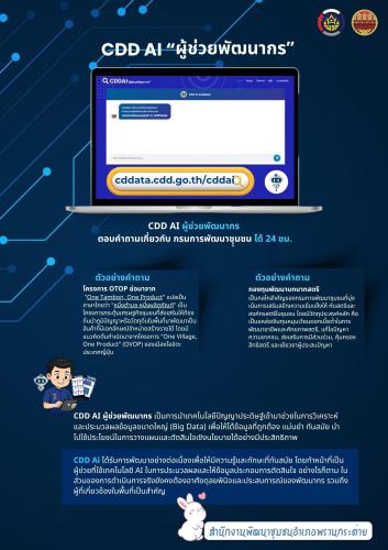 CDD AI ผู้ช่วยพัฒนากร เป็นการนำเทคโนโลยีปัญญาประดิษฐ์เข้ามาช่วยในการวิเคราะห์และประมวลผลข้อมูลขนาดใหญ่ (Big Data) เพื่อให้ได้ข้อมูลที่ถูกต้อง แม่นยำ ทันสมัย นำไปใช้ประโยชน์ในการวางแผนและตัดสินใจเชิงนโยบายได้อย่างมีประสิทธิภาพ